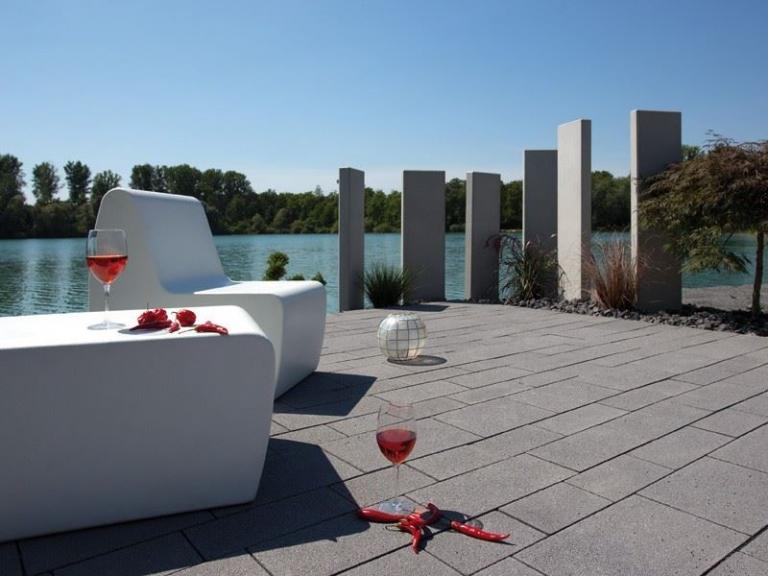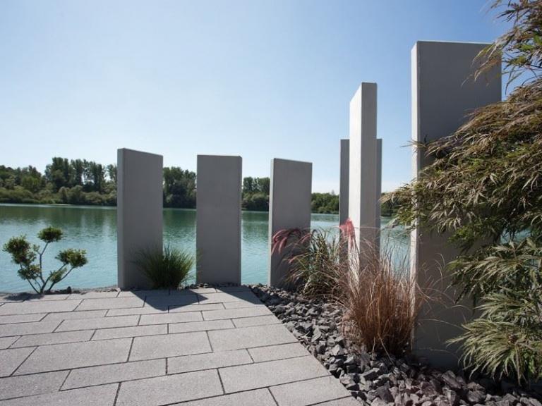 Insbesondere in der modernen Architektur finden Stelen in Sichtbeton ihren Platz. Nebeneinander aufgereiht gliedern sie eindrucksvoll den Freiraum und bieten gleichzeitig einen eleganten Sichtschutz. Stelen sind ausdrücklich nicht zur Böschungsabfangung bzw. Hangsicherung geeignet.
