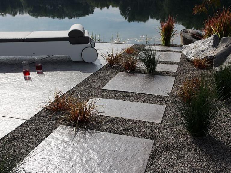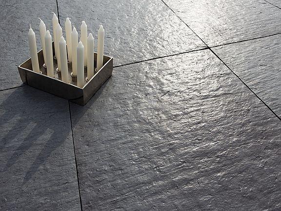 Die traditionelle Optik von Schiefer prägt seit Jahrhunderten menschliche Bauwerke. Die Outdoorplatte Ambient 01 verbindet das elegante Aussehen der spaltrau anmutenden Ansichtsfläche mit den Vorzügen des zukunftssicheren Werkstoffs Beton, der - nebenbei bemerkt - auf eine ähnliche lange Tradition zurückblicken kann.